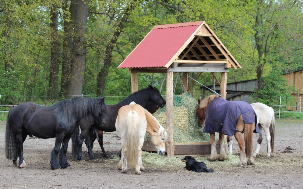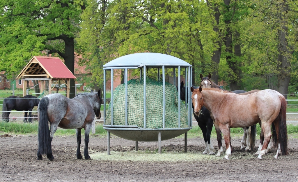 Wir bieten unseren Pferden durchgehend rohfaserreiches und zuckerarmes Heu - soweit möglich in Raufen und Netzen - an.